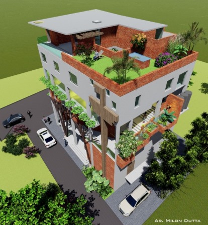 Land/built/open space 5,000/12,000/3,500 sq. ft., Eco-Sustainability, Minimalistic Behavioral Design, Malleable spaces and boundaries, Syncretic aesthetics (Bengali, Japanese, Nordic), Natural materials and organic shapes, Automated tech infrastructure